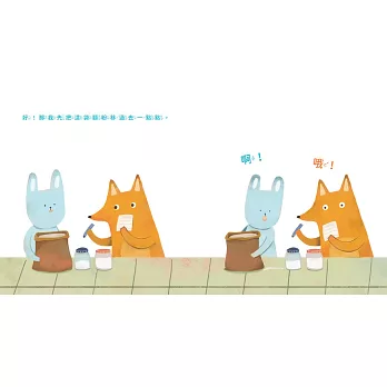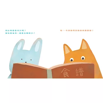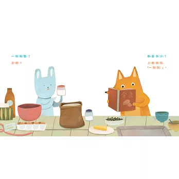 兔子和狐狸翻開食譜,拿出麵粉、糖粉、奶油、雞蛋和巧克力豆,一字排開,準備做一份特別的生日禮物。沒想到,他們馬上就遇到難題: