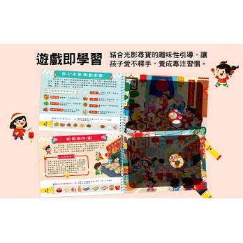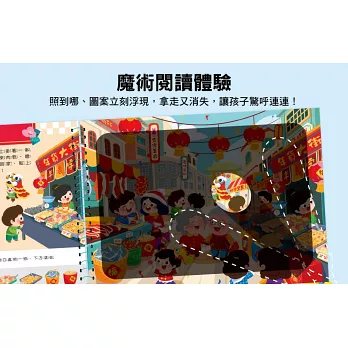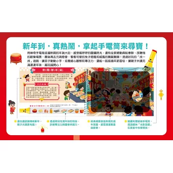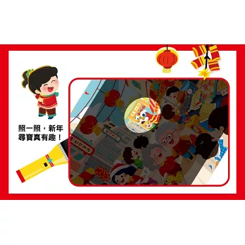 拿起手電筒,準備一起探索熱鬧的新年街景吧!結合光影找一找的互動玩法,只要用隨書附贈的紙板手電筒照一照,原本看不見的圖案立刻浮現,移開後又會消失,給孩子帶來驚呼連連的閱讀驚喜。書中以熱鬧的新年場景為主題,融入年節習俗、街市風景與生活認知,在遊戲中培養觀察力、專注力與閱讀興趣,是適合親子共讀的互動遊戲書。