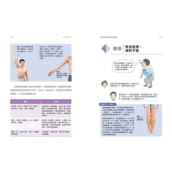 | 寒邪偏盛 | 肢體關節、肌肉冷痛,疼痛劇烈,疼痛位置固定,遇熱 疼痛緩解,陰雨天或遇冷疼痛加重,伴有手腳冰涼的症 狀。 | |