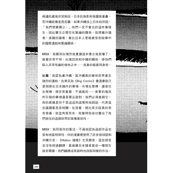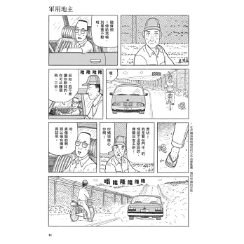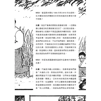 比嘉慂漫畫的魔力,讓我在翻頁之間返回研究的田野地點。龜甲墓和新都心的建設、甘蔗田和軍用吉普車、泡盛和未爆彈、平御香和鐵刺網、洞窟的深處和海的彼端,我又看到了曾經走過、看過、聞過、摸過的一切。僅僅是一格以巨大擬聲詞主導的分格,便把我帶回到那個與報導人一起看電視、卻突然聽不見台詞的瞬間──美軍軍機飛越的轟鳴蓋過一切,我們只能對看彼此眼中的了然和嘴角那一抹苦笑。如同漫畫中的町田先生一臉平靜地說:「在這裡生活就是這麼一回事。」