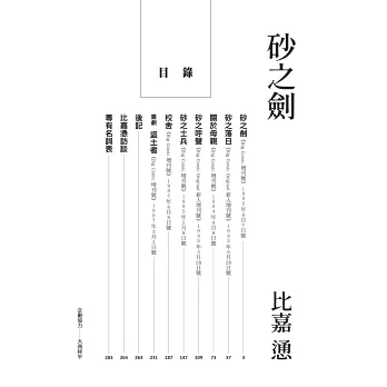 沖繩作為日本二戰期間唯一發生陸地戰的區域,《砂之劍》記錄了沖繩戰役在美軍登陸、日軍節節敗退的時代背景下,沖繩原住民如何在日本與美國軍方兩造之間求生存。7篇短篇、7位包含自願來到偏鄉的教師、在地方與軍方間謀取民眾最佳利益的村長、獨自照護兒女全家在墳墓中躲避的母親、作為日軍與美軍翻譯橋梁的沖繩士兵等,比嘉慂筆下的沖繩民眾展現了不迎合日本軍國主義,在全面備戰與全員玉碎的政策方針之外,相當實事求是的一面。