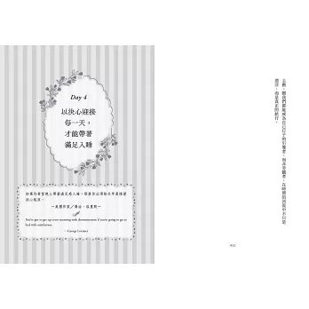 書裡談到「失敗」、「善良」、「感恩」、「行動」、「勇氣」、「自我價值」、「與自己和解」……這些主題看似分散,卻都指向同一件事:如何慢慢成為一個更柔軟卻堅定的人。人生的挑戰並不會因為我們練習正向念想、學習覺察、設定小目標就消失,但在一個又一個清晨裡重新與自己站在一起,會讓我們更能面對那些風浪。