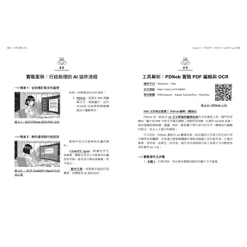本書最核心的價值,就是讓讀者掌握「不同職位需要不同類型的 AI 員工」的完整方法。第二章中,讀者將學會如何利用 PDNob + ChatGPT Agent 打造「行政助理型 AI」:它能處理複雜 PDF、校對合約、生成郵件回覆、安排會議,甚至連結 Gmail 自動管理收件匣。第三章則帶你進入「專案經理型 AI」的世界,Skywork 能自動生成簡報、研究架構;Proactor AI 能在會議中立即錄音、摘要、擷取行動項目、提出風險提示,如同一位「主動式會議副駕駛」。