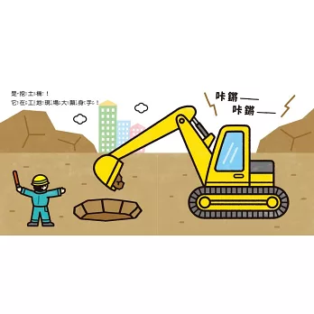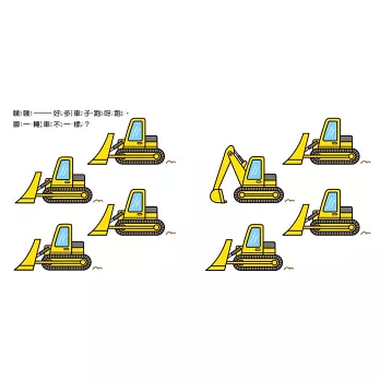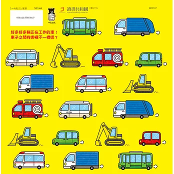 這本可愛的工作車繪本以跨頁形式呈現問題與答案,先引導孩子從多輛車的頁面中指出「哪一輛車不一樣?」,比較它們的相異之處,翻頁後便是該輛車的車種名稱、功能、聲音和工作情境。