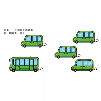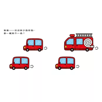 除了書中固定的「哪一輛車不一樣?」問題之外,爸媽可以延伸和孩子討論:「這輛車有哪裡不一樣?」、「這輛車是什麼用途?」、「你最喜歡哪一輛車?」等問題,讓孩子有更多表達想法的機會,增進親子間的互動樂趣,也能讓孩子學習如何組織語言。