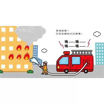 根據2~4歲孩子的理解程度設計車子的外形,線條簡潔、用色鮮明,差異之處正好與該種工作車的用途或特色有關,例如消防車的差異之處是雲梯和高壓水槍,用途是「趕往火災現場」救火;救護車車頂有著紅色的警示燈,因為它「會將傷患和病人送往醫院」,緊急時刻需要鳴笛亮燈,提醒其他車輛讓道……孩子可以自己找找看有哪些不同的地方,家長在旁適時補充其設計用途,讓孩子不僅能夠在「找到了!」的瞬間感受到喜悅與成就感,也能培養觀察力與專注力。