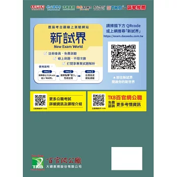 1.每一本書皆收錄該科目的歷屆考題及詳解,讓考生不需費力地上網爬文找歷屆試題,只要一本試題大補帖在手,便能立即實戰演練,並且有效整理歷屆考試重點,作為考前衝刺複習書。