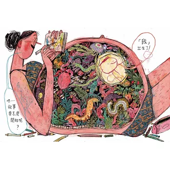 故事的開篇母親巨大的形象清晰可見,但隨著每一頁的展開,當孩子在自己的人生道路闖關,母親似乎逐漸縮小融入孩子創作的畫面中,也從主動照顧和引導,轉為故事裡的配角。 如果你仔細觀察,每一頁母親都變身成不同的角色,有時是織毛衣的美人魚,有時則是洗衣服的人馬,不時還彎腰收拾殘局。但有時媽媽也會變成噴火龍,有時也會累倒,不過總是陪在孩子身後,引發人思考母親角色定位與努力。