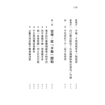少做,才能成就更多。當我們有勇氣放下「事事親力親為」的執念,才開始成為領導者。這是我在本書中感受到最深刻的力量,也是我誠心推薦給每一位主管的理由。願這本書帶你找回餘裕,也引領你走向更高效、更有意義的領導之路。