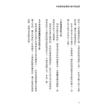 書中透過許多實際案例,描繪了「忙碌主管」與「高效主管」的差別,並讓讀者看見: