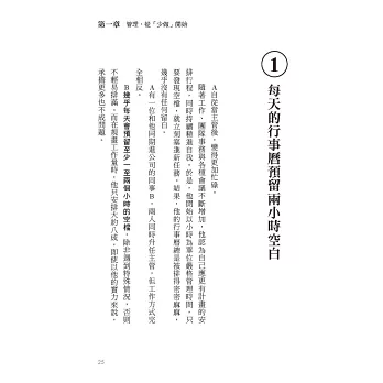 但市面上多數談時間管理的書籍,幾乎只著重於工作技能,這便是為什麼有的主管就算讀了很多商業書,仍無法脫離繁忙的根本原因。而理解人際互動與情緒控制的技能後,才能掌握到屬於領導者的時間管理術。
