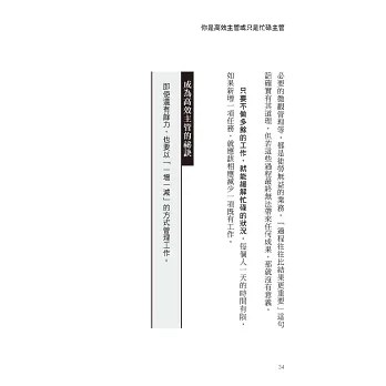 這正是本書要提醒我們的:你是高效主管,或只是忙碌主管?領導者的關鍵不在於做多少,而在於是否懂得「少做」與「不做」。這不是逃避,而是取捨──把有限的時間投入真正能創造價值的事上。