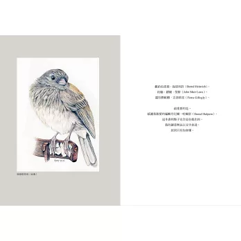 寫鳥類觀察日記,譚恩美從只認得後院的三種鳥,變成能夠認得六十三種鳥。後院的鳥兒們,陪伴譚恩美度過令人沮喪的社會分裂時期,也度過疫情封城帶來的不安,與死亡伴隨的悲傷。這不僅僅是觀察與繪畫,譚恩美以她細緻入微的描寫和幽默,探索賞鳥、大自然和隱藏在我們身邊的平凡之美,看到了不一樣的世界。