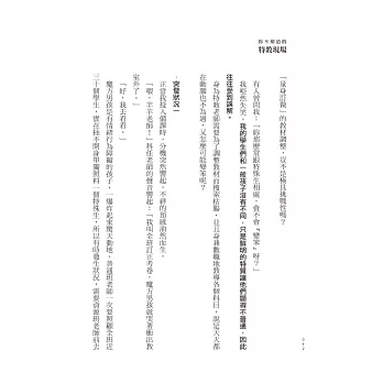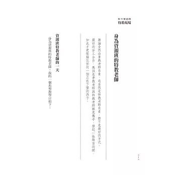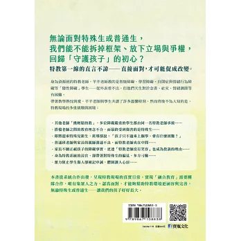 本書從系統合作出發,呈現特教現場的真實日常。實現「融合教育」需要團隊合作,唯有集眾人之力,認真面對,才能夠幫助特教環境更涵容與完善,無論特殊生或普通生──讓我們的孩子好好長大。