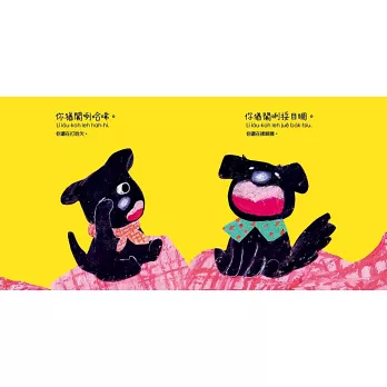 主角是活潑又逗趣的黑狗姊弟,言行舉止貼近幼兒的日常生活。故事中安排了許多令人會心一笑的小橋段,既可愛又充滿節奏感,特別能吸引孩子一讀再讀。