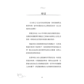 雖然個性截然不同,但她們都能發揮所長、朝著自己的目標邁進,並在動盪不安的時期裡,學會珍惜生命中最原本、最珍貴的愛、安全、和平和健康,成為成熟懂事的小婦人。