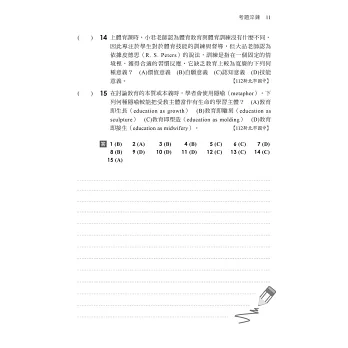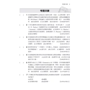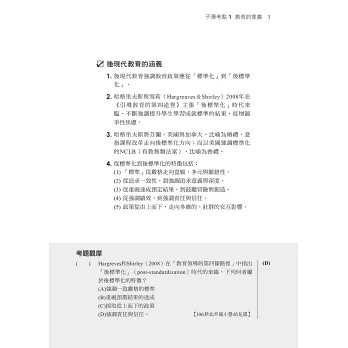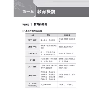 基於上述,全書內容係以「一本書主義」優先納入「重要考點」,輔以目前教育體系最新最重要的資料與議題,採全方位設計編寫,兼顧教育相關科系者的加深加廣,以及非教育相關科系者,能從頭學起且紮穩實力。為此,編寫方式是統計過去題目出處並配合考題趨勢,以「子彈考點」分類,讓你如子彈飛出一般快、狠、準地命中考題核心,並提供範例練習,幫助你了解每個考點的深層涵義。除此之外,每個章節之後另搭配「歷屆考題集錦」,通古貫今,熟能生巧。