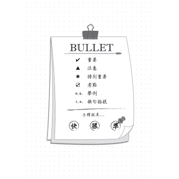 獨創「子彈考點法」,以符號代表內容重要程度。其中✔(重要);☑(考點);✱(特別重要);▲(注意);「e.g.」舉例來說;「i.e.」換句話說,讓你可以按照準備時間的多寡,透過符號一目了然搜尋考點。