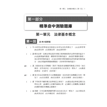 本書第一部分為精準命中測驗題庫,共分七個單元,將重要的法律,如憲法、行政法、民法、刑法及訴訟法等,做一系統分類,並經由名師精心設計。既收錄經典題目,又能有效分配試題難易度,層層遞進,在解題過程中,掌握本科脈絡,以期達到考前關鍵時間內快速複習、事半功倍的效果。