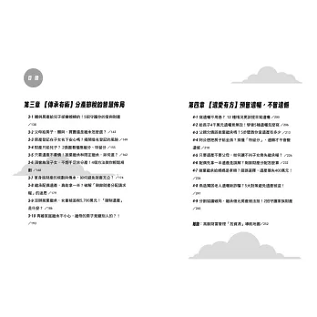 本書共分為四大篇章,從養老規畫、防剝削、傳承到遺囑,完整拆解熟齡族最重要的財務安全問題。