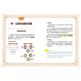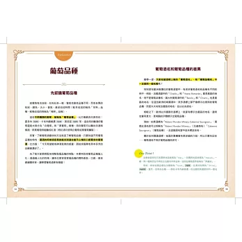 每一種葡萄品種都有專屬的代表角色插畫,從服裝、表情、小道具,表現品種的風味與特質,幫助讀者輕鬆記憶,讓學習過程既輕鬆又有趣。