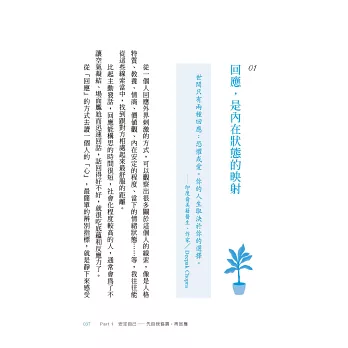 這五十二篇文章,都在探討回應的「內在設定」,目標是陪伴讀者從「無意識的反應」進化到「有意識的回應」,全書架構在四個核心面向: