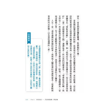 人際關係是人生中非常重要的無形資產,如果對人際關係的「內在設定」是計較輸贏的零和賽局,那麼一生都將活在競爭當中,難以享受「人和」帶來的價值;真正好的關係,是可以一起變好的「正和遊戲」。在這個部分,我們會談怎麼在對話中先嘗試理解,而不急著做價值判斷;怎麼把尖銳的「反駁」軟化為並肩的「討論」。而當我們開始聽得見那些微小的「連結呼喚」,哪怕只是一個眼神、一句簡單的回應,都能為彼此的「情感存摺」積累財富。