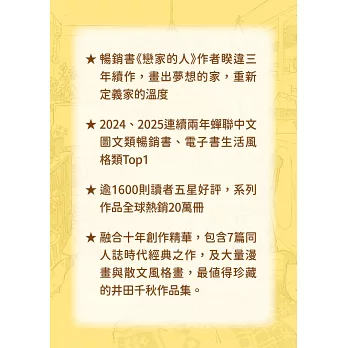 ___________________________________Q=圓神出版 A=井田千秋 Q:《戀家的人》與《期待開動》都展現出對「家」與「日常」的細膩觀察。您在創作這些作品時,是如何挖掘素材的?會從哪些地方獲得創作靈感?是觀察路人、閱讀、還是其他方式?A:我的創作起點來自生活、經驗與記憶,如快樂的回憶、舒適 more