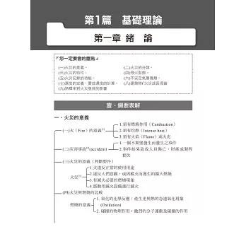 3.重要名詞:解釋火災學在考試上常出現的專有名詞,在寫到「解釋名詞」這一類的考試題型時,往往能手到擒來,對火災學的任一名詞作徹底的解釋。況且本書在此部分所呈現的不是冗長的文字敘述,而是做條列式的整理,專有名詞的定義、公式、相關法令、案例、形成原因、統計數據完整呈現,有條有理,是複習專有名詞的好幫手。