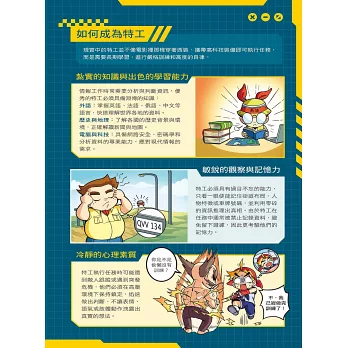 設有「職業小百科」單元,藉由淺顯易懂的文字和生動豐富的圖片,詳細介紹間諜與特工的差異性和共同點、間諜的起源及演變、特工需要具備的條件、間諜有哪些種類、間諜使用的偽裝技巧和裝備有什麼特色、世界著名的情報機構有哪些、情報機構如何運作,並介紹防範間諜的方法,幫助小讀者系統性學習跨領域的歷史文化知識及拓展世界觀。