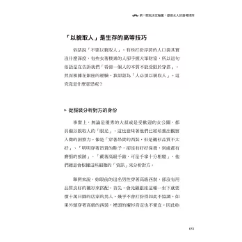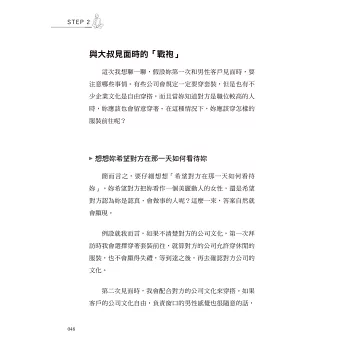 請妳想想看。當妳走在街上的時候,身邊都是五十幾歲、六十幾歲的大叔。而在大企業裡擁有重大專案決策權的人,都是五十幾歲經理級以上的大叔們。與其厭惡他們,不如了解他們的做事原則,逐漸拉攏他們成為自己人,建立起有意義的關係,人生才會更加豐富多彩。