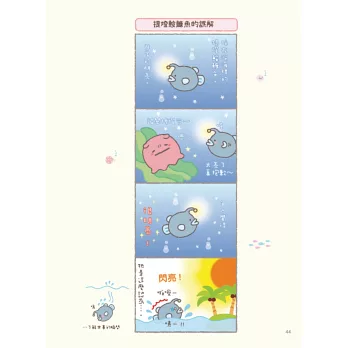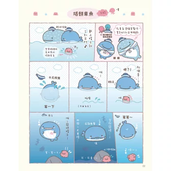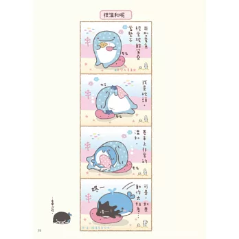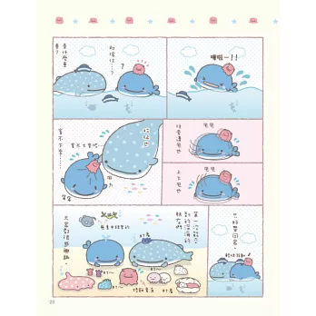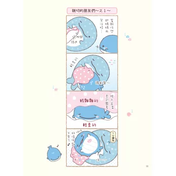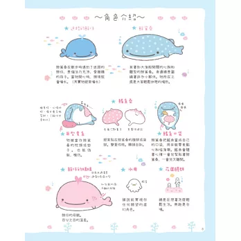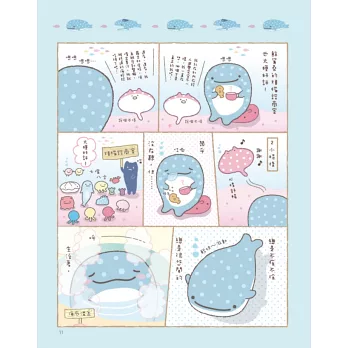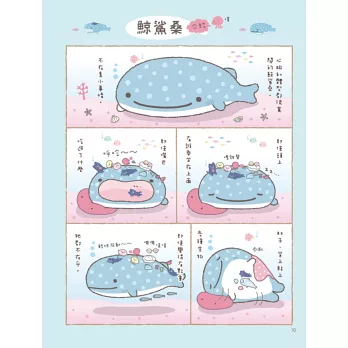 本書以四格漫畫、單頁漫畫搭配短篇插畫,呈現出鯨鯊桑與牠身邊迷路的鯨仔、喵海帶、鰩魚、章魚塗鴉室、珍珠兄弟等眾多好友,在大海中輕鬆有趣的生活方式。