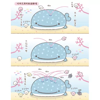 鯨鯊桑會將特製的磷蝦仙貝和海葡萄,裝在鰩魚口袋裡帶著走,也會緊貼著可愛的鯨仔臉頰、聆聽花園鰻的合唱。