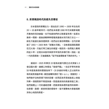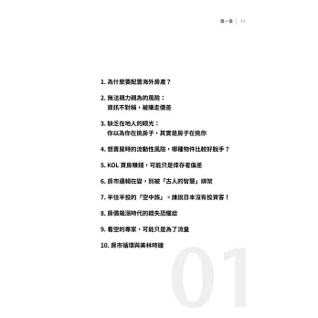 本書第一章探討配置日本房產的必要性,以及外國人購屋可能面臨的風險。第二章介紹各種適合自住的房型優缺點。第三章則以整章篇幅剖析東京各區域特色,並以山手線環狀道路劃分的蛋黃、蛋白與蛋殼區為框架,協助讀者選擇合適地段。第四章分享買房決策的核心觀念。第五章聚焦購屋常見的潛在陷阱與避雷策略。第六章則針對越來越多讀者關心的移居議題,說明日本簽證種類、永住權與國籍取得途徑,並深入介紹外國人可善用的免稅投資帳戶NISA相關實務。