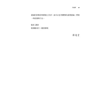 全書以十大步驟為主軸,從願景前置作業、可行願景、細化願景、SWOT分析與策略地圖,到KSF與KPI設計、行動計畫、A3報告卡、績效分析與策略校準,系統性的以策略決定方向、以戰術規劃方法、以戰技落實執行;結合數位轉型,使組織在導入平衡計分卡策略管理時更具效率與一致性,強化協作並讓改善形成持續循環。透過本書內容,讀者得以在經營管理的挑戰中,建立清晰、穩健且以永續為核心的策略管理能力,並發展具韌性的組織運作模式。