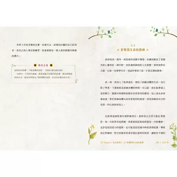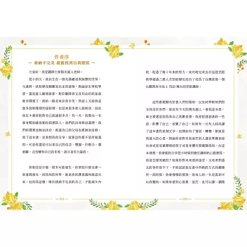 會寫下這本書,最主要的原因,是因為我自己喜歡閱讀。曾經有些文字,在我迷惘或低潮的時候,悄悄影響了我,也改變了我看待世界與自己的方式。那些話,成了我繼續走下去的力量。如果有一天,有人因為讀到這本書中的某一段文字,而開始願意嘗試、願意轉變,那就是我寫下這本書最大的心意。