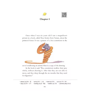 1 我六歲的時候,在一本書上看到一張很有趣的插畫,那本書叫做《大自然的真實故事》,內容是描述關於原始雨林的故事。那張插圖畫的是一隻蟒蛇正在吞食獵物的模樣。你看,就是下面這張圖。