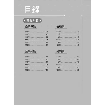 一、本書收錄包含企管類專業科目(A)企業概論、法學緒論;以及專業科目(B)管理學、經濟學。
