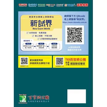 不需費力上網爬文找歷屆試題,只要一本試題大補帖在手,便能立即實戰演練,並有效了解該考試考科重點,為考前模擬與衝刺複習。