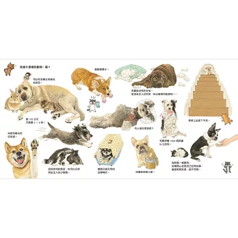 作者以手繪的插圖展示出狗狗的各種可愛姿態,除了讓插圖顯得更加溫柔與溫暖,也為狗狗增添了一份溫馨感。