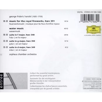 韓德爾:水上音樂、皇家煙火◎奧菲斯室內管弦樂團《皇家煙火》是為慶祝英、法兩國在愛拉沙伯簽定和約而作。韓德爾親自指揮這部作品首演的時候,只用到管樂器和打擊樂器。但在這次演出後,後韓德爾還是在總譜中添上了弦樂器,但是不影響樂曲該有的壯麗色彩。據說《水上音樂》是遲滯未歸的韓德爾向英王喬治一世示意的作品。不過,這則故事很有可能是後人穿鑿附會的傳說,因為《水上音樂》的創作年代是1717年,這時喬治一世已經登基三年,然而曲名《水上音樂》卻極可能是喬治一世的意思,因為首演的場合是在泰晤士河皇家遊船的宴會上。這是韓德爾最重要的作品之一,從中可以聽到他精妙的管弦樂配器。