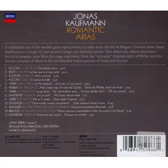 德國男高音考夫曼剛在今年與笛卡簽約,這張浪漫男高音詠嘆調是他在笛卡的首張專輯。這位能從莫札特唱到華格納、從義大利浪漫經典歌劇唱到巴洛克古樂的男高音,不僅多才多藝還是位出色的藝術歌曲演唱家。他上一張灌錄的理查.史特勞斯藝術歌曲錄音,才剛贏得英國留聲機年度藝術歌曲獎,由此可見他是位在詮釋實力上受到國際肯定的少見歌唱家。