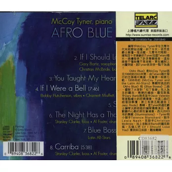 《Afro Blue》是McCoy Tyner西元1998到2003年間,由Telarc唱片發行的五張唱片精選。先看第一和第七軌,1998年的《McCoy Tyner and the Latin All-Stars》專輯所挑出的《Afro Blue》和《Blue Bossa》二曲。擺脫了大家對「拉丁音樂」先入為主的觀念,精練的編曲,薩克斯風手Gary Bartz與長笛手Dave Valentin等差點噴火的即興獨奏,光這二曲已經值回票價。第三和第五軌選自《Jazz Roots》專輯,是Tyner向過往爵士鋼琴大師致敬的鋼琴獨奏演出,喜歡聽內心戲的朋友會滿意。西元2003年的專輯《Illuminations》,Tyner和小號手Terence Blanchard、鼓手Lewis Nash、貝斯手Christian McBride,加上老戰友Bartz的薩克斯風,五個人把《If I Should Lose You》奏到如泣如訴,難捨難離。