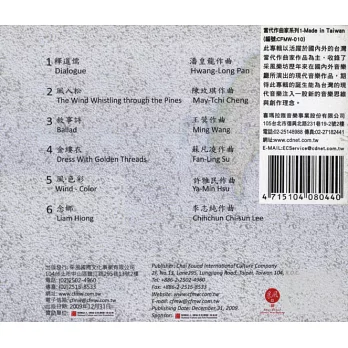 此專輯以活躍於國內外的台灣當代作曲家作品為主,收錄了采風樂坊歷年來在國內外音樂廳所演出的現代音樂作品,透過專輯的錄製,不僅介紹台灣作曲家新創作的音樂風格,也充分傳達作曲家內心所構思的音樂情感;期待此專輯的誕生能為台灣的現代音樂注入一股新的音樂思維與創作理念。