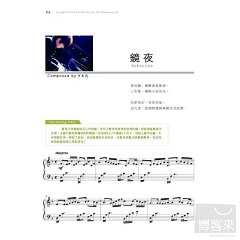經典代表作《鏡夜》更是獨家揭密無影手彈奏技巧,一窺V.K克魔幻炫技的奧秘。專輯所有曲目樂譜,不分上下集,收藏一次到位!