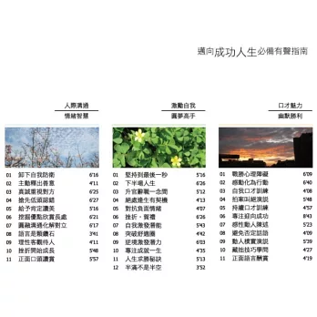 戴晨志博士首度匯集五百萬冊經典暢銷著作,以有聲方式,循序漸進地引領您前往:「人際溝通‧情緒智慧」、「激勵自我‧圓夢高手」、「口才魅力‧幽默勝利」成就豐富人生的必備領域。