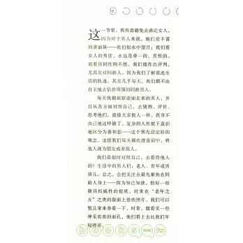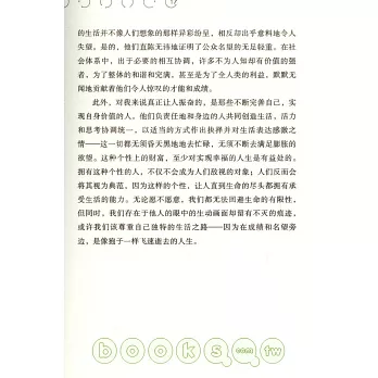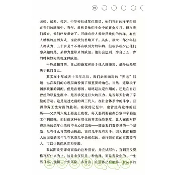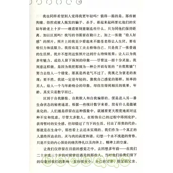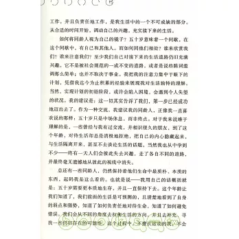作者萊納斯先生就是一位五十歲的男人,且是一位熱愛生命的男人。他在三十六個篇章中,幾乎談到了生活各個層面的問題,他以真誠的筆觸來激勵同齡人的勇氣和信念,或者他講出真相——因為他們彼此理解並了解。他說「每時每刻,都有幸福的方式可以選擇;五十歲,只是中場休息」。他也非常明確地說。這個間歇,他要與同齡的朋友們共同思考生活和未來。而他思考的意義就在於,生活每天都是新的,今天和未來更為重要,即便五十歲!他的文字不是主觀的、個人的說教和空洞的激勵,而是處在完全平等的位置,時而簡練嚴密、時而犀利幽默地圍繞題目侃侃而談。他沒有刻意煽情,也沒有老於世故,而是層層遞進地表明自己的觀點,同時又給人思索和選擇的空間。他的文筆是男性的,卻毫不固執和褊狹,有時甚至坦率地說出自己經歷的生活——他把這本書的讀者們視為朋友——他談到衣食住行和健康,談到性和情人,談到輩代間的寬容和交流,談到讀書和藝術,談到信仰和政治,也沒有回避財富和死亡,最后他談到幸福、愛情和希望……