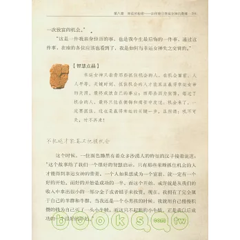 一次偶然的機會,我邀請和自己一起回國的留學生朋友,與我不同之處,他做的非常成功。我對他提了一下這本書中的理財智慧。他笑著對我說︰“難道你在留學的時候沒有讀過這本書?”我頓時啞口無言。我自然是讀過的,但是,由于自己的年輕無知,錯過了學習的最佳機會。