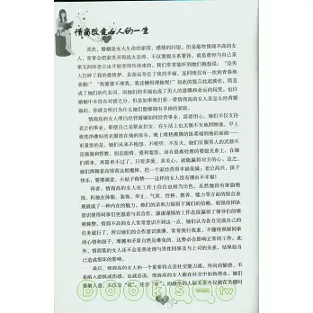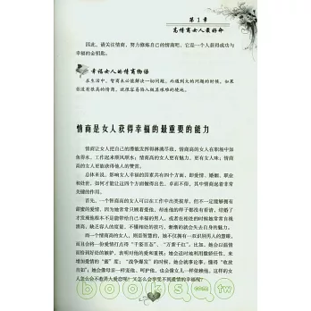 情商是女人重要的生存能力和技巧,是一種發掘情感潛能、運用情感能力影響生活各個層面和人生走向的最為關鍵的因素之一。在為人處世中,情商高的女人的一個重要特點就是社交能力強,融洽的人際關系不僅能在關鍵時刻助她們一臂之力,還能給她們帶來心理的滿足感和幸福感。而情商低的女人,人際關系一般都非常糟糕,因為她們不懂說話的技巧和策略,所以她們沒有什麼朋友,生活中常會感到空虛和寂寞,自然感受不到幸福。《情商改變女人的一生》從女人的內省情商、情緒情商、性格情商、戀愛情商、家庭情商、交際情商、職場情商等多個方面,告訴女人如何利用情商的力量發掘潛能,贏得愛情與事業的雙豐收,從而獲得幸福而成功的人生。