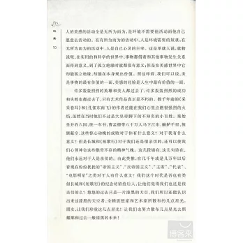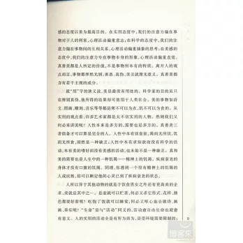 孟實先生還寫了一部大書一一《文藝心理學》。但這本小冊子並非節略;它自成一個完整的有機體;有些處是那部大書所不詳的;有些是那里面沒有的。一一“人生的藝術化”一章是著明的例子;這是孟實先生自己最重要的理論。他分人生為廣狹兩義︰藝術雖與“實際人生”有距離,與 “整個人生”卻並無隔閡;“因為藝術是情趣的表現,而情趣的根源就在人生。反之,離開藝術也便無所謂人生;因為凡是創造和欣賞都是藝術的活動。”他說︰“生活上的藝術家也不但能認真而且能擺脫。在認真時見出他的嚴肅,在擺脫時見出他的豁達。”又引西方哲人之說︰“至高的善在無所為而為的玩索”,以為這“還是一種美”。又說︰“一切哲學系統也都只能當作藝術作品去看。”又說︰“真理在離開實用而成為情趣中心時,就已經是美感的對象……所以科學的活動也還是一種藝術的活動。” 這樣真善美便成了三位一體了。孟實先生引讀者由藝術走人人生,又將人生納入藝術之中。這種“宏遠的眼界和豁達的胸襟”,值得學者深思。文藝理論當有以觀其會通;局于一方一隅,是不會有真知灼見的。